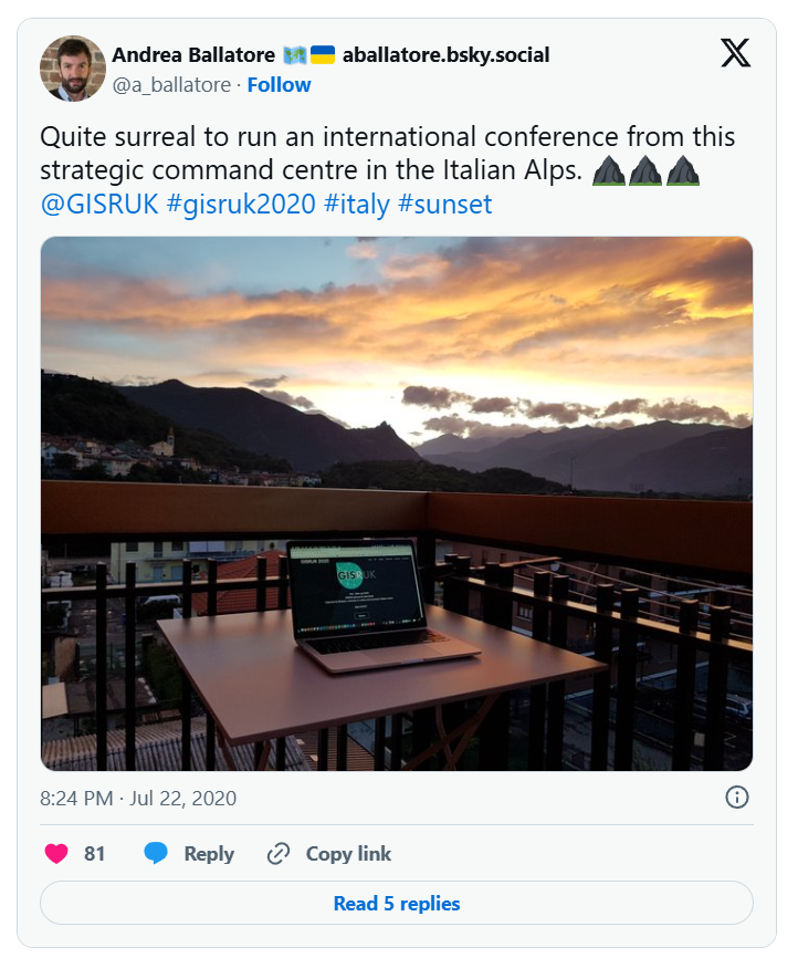 Quite surreal to run an international conference from this strategic command centre in the Italian Alps. ⛰️⛰️⛰️ @GISRUK #gisruk2020 #italy #sunset