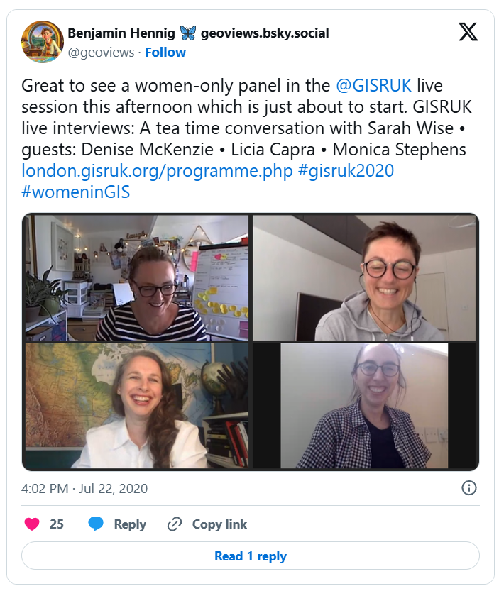 Great to see a women-only panel in the @GISRUK live session this afternoon which is just about to start. GISRUK live interviews: A tea time conversation with Sarah Wise • guests: Denise McKenzie • Licia Capra • Monica Stephens #gisruk2020 #womeninGIS — Benjamin Hennig (@geoviews) July 22, 2020