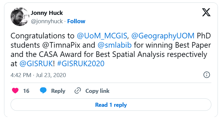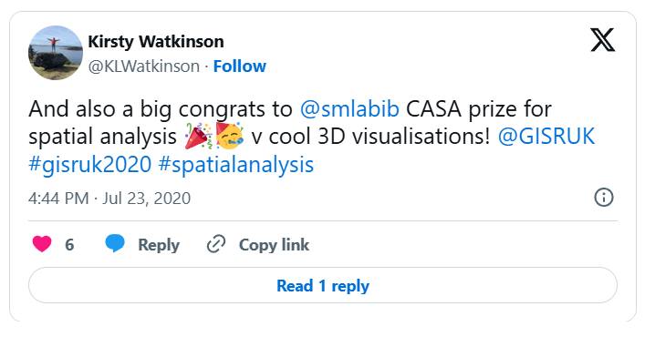 And also a big congrats to @smlabib CASA prize for spatial analysis 🎉🥳 v cool 3D visualisations! @GISRUK #gisruk2020 #spatialanalysis