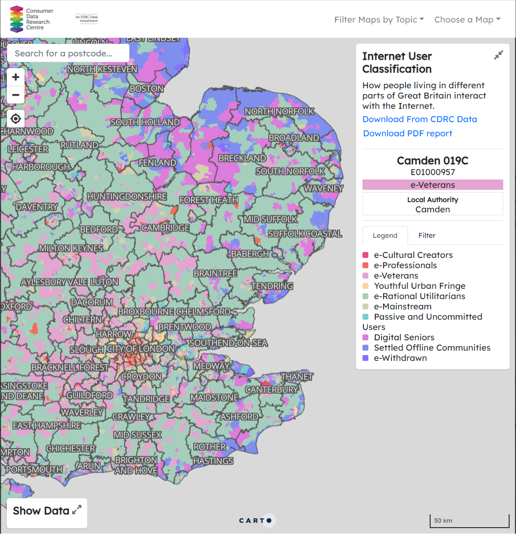 While ONS have not published their Hard to Count index, they have shared it with Local Authorities to help them target their census engagement work. A similar example looking at who is digitally excluded is the Internet User Classification, created by the Consumer Data Research Centre, open and freely available for anyone to use. Here, they looked at a range of factors (including internet connectivity and usage) and created a geodemographic classification identifying who uses the internet (e.g. e-Cultural Creators, e-Professionals) and who does not (e.g. Settled Offline Communities and e-Withdrawn). Geodemographics have some advantages over indices, in that they can help describe who doesn’t have internet access, and can be used to identify specific measures to help address this and/or used to identify individuals or groups with specific characteristics.