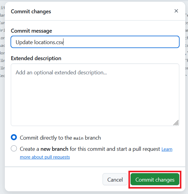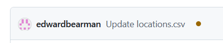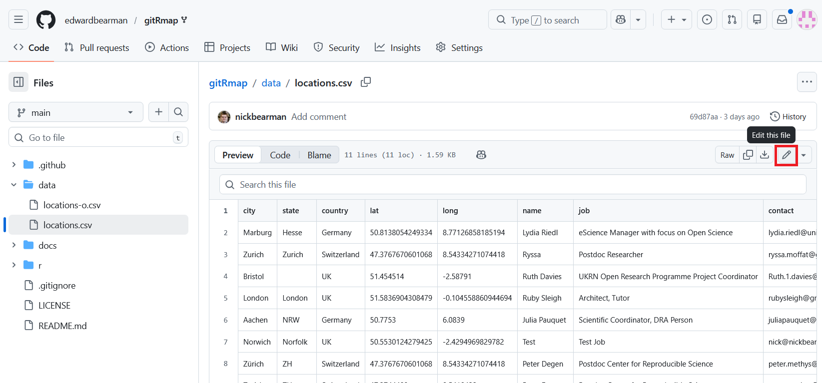 locations.csvin thedatafolder to trigger the GitHub actions and run the R code to generate the map.Just to test everything is working, click Edit, and delete one of the rows.