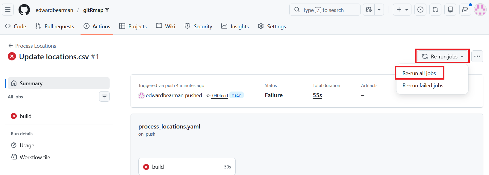 If you do get an error, and manage to solve it, you can edit locations.csv to re run the build, or you can go to Actions and click Re-run jobs > Re-run all jobs: