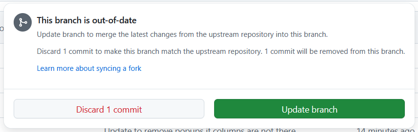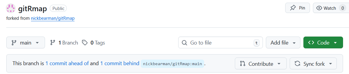 If I update the gitRmap repo, then you will get a message at the top of your repo saying This branch is 1 commit ahead of nickbearman/gitRmap:main. This means I have changed the code, but your fork doesn’t have that update.
