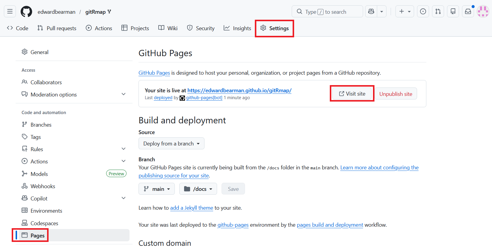 - Source should be set to Deploy from Branch