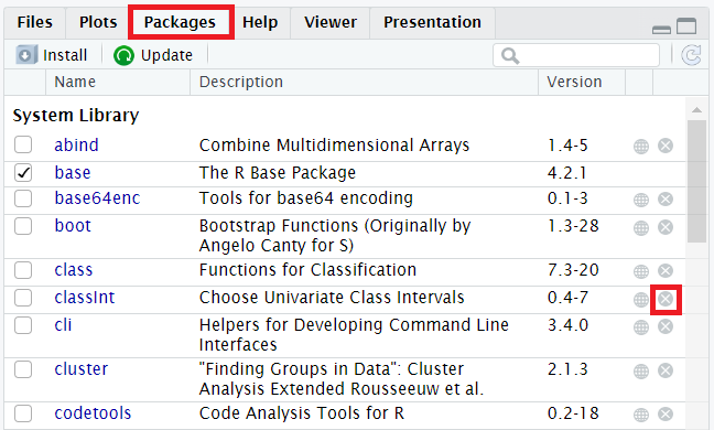 remove.packages("classInt")(e.g. for theclassIntpackage) or - Open the Packages tab (on the right) and click the